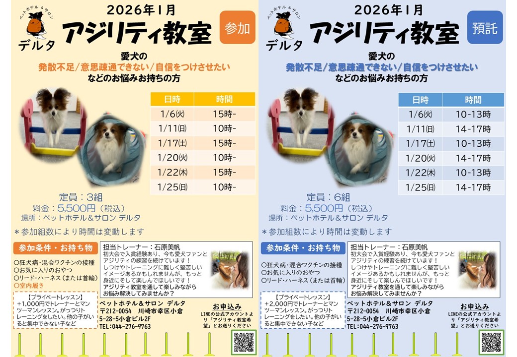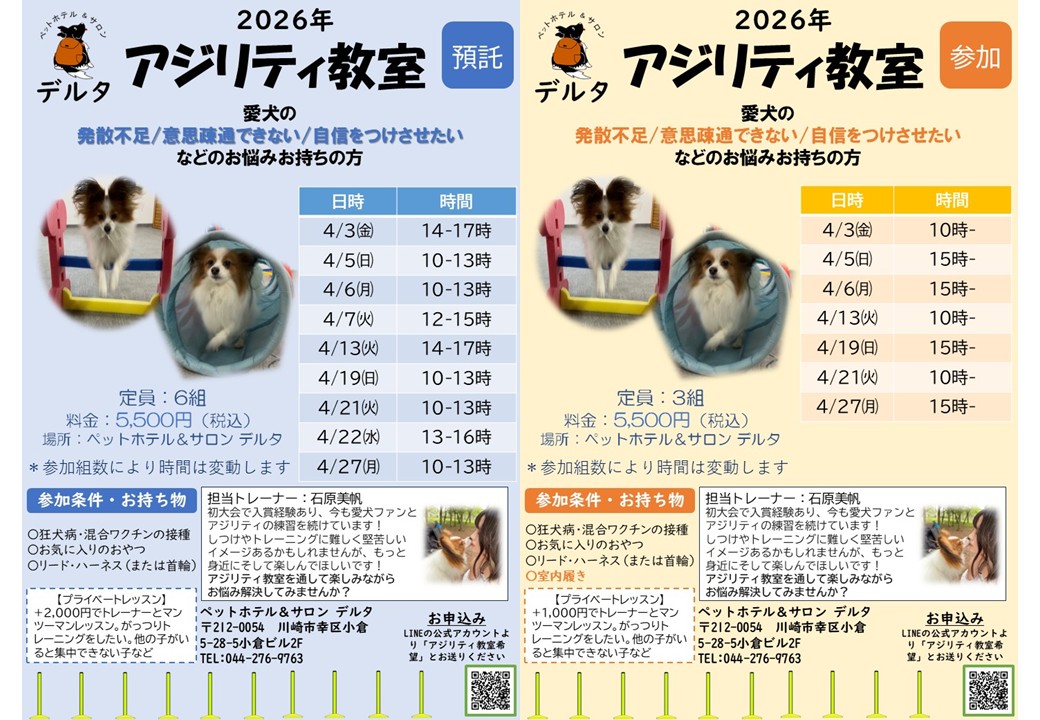 *LINEからのお問い合わせの際は「〇〇クラス参加の希望です」とお書きの上、飼い主様のお名前と、参加予定のワンちゃんのお名前、犬種、年齢をお知らせください。