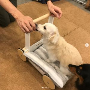 手押し車の上が気に入ったサンちゃん、みんなに運ばれます?